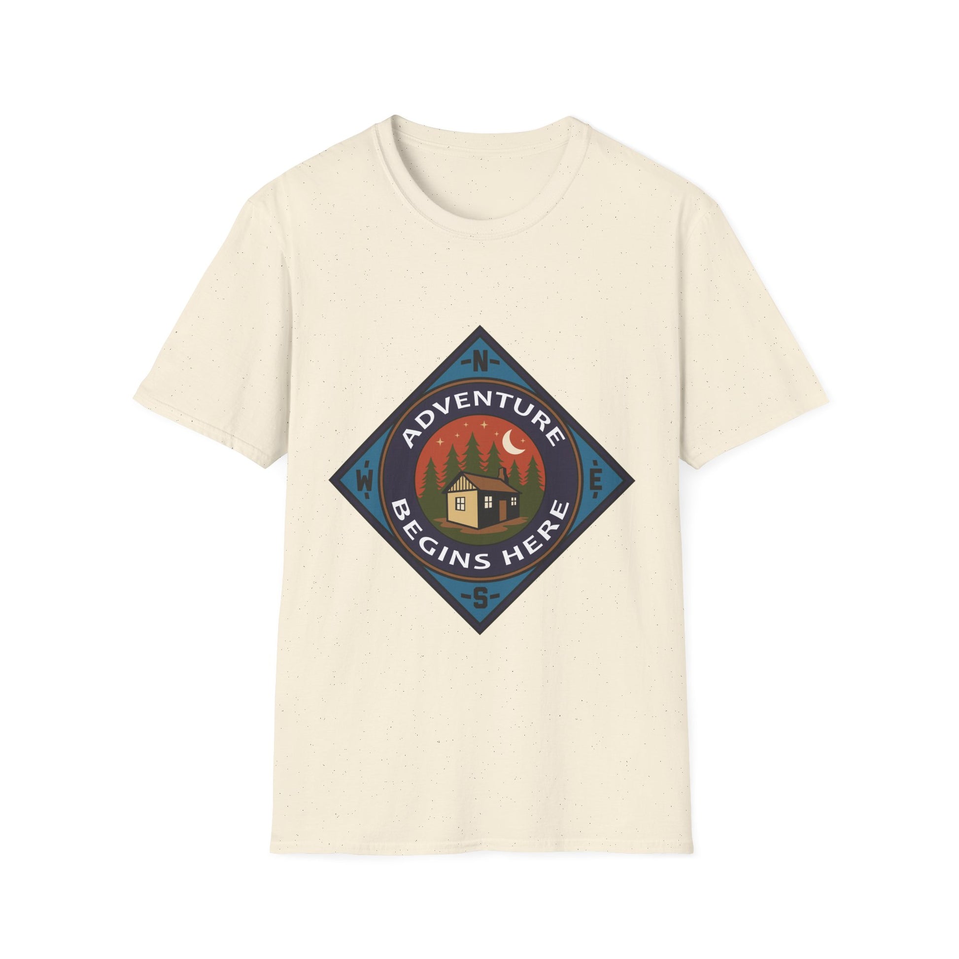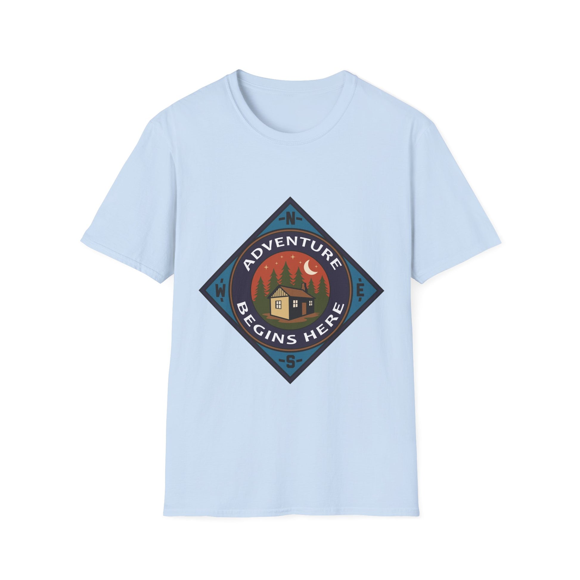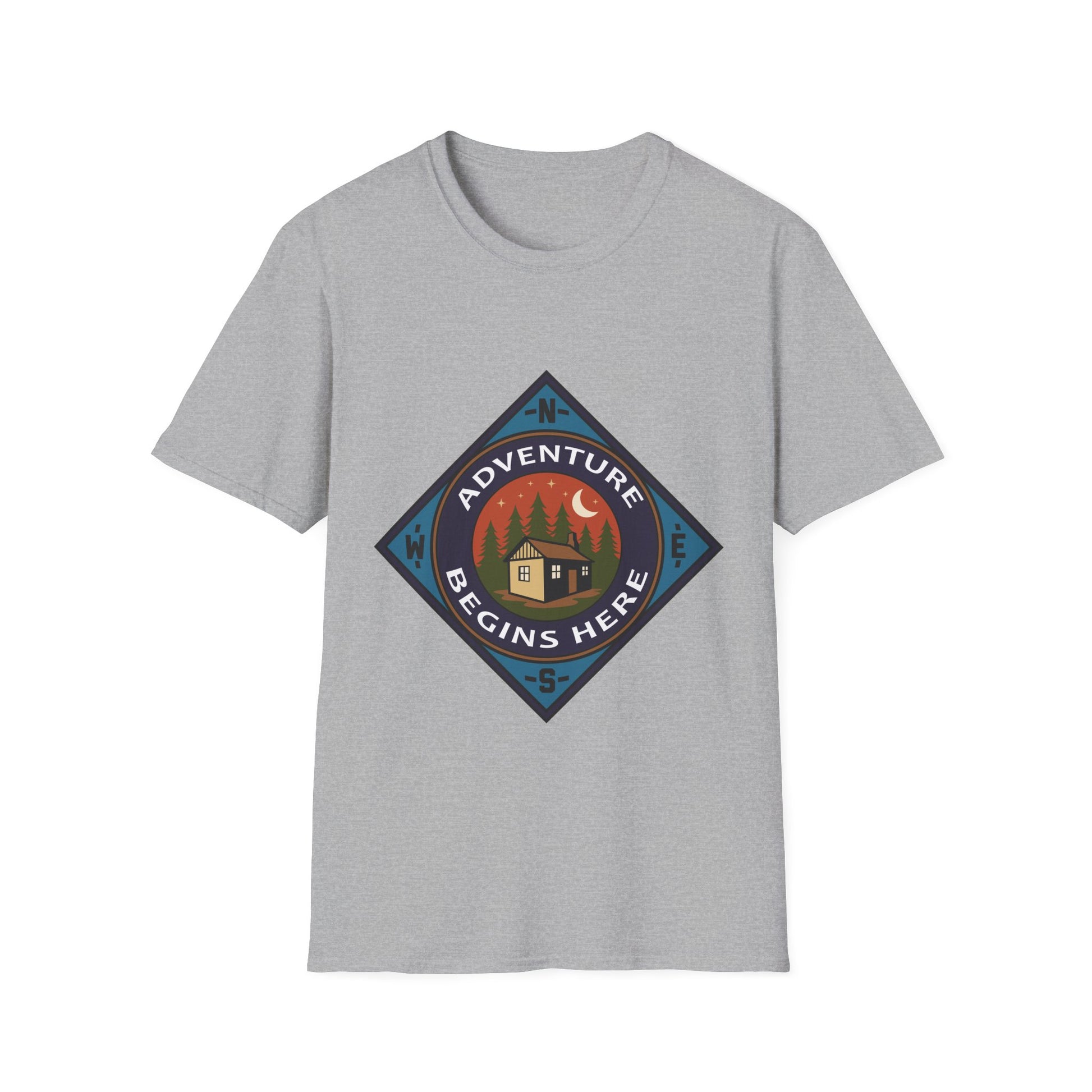 Bring a sense of adventure to your wardrobe with this unisex T-Shirt. The design 'Adventure Begins Here' sets the tone for exploration and new beginnings. Perfect for those who love the outdoors and seeking new experiences. Ideal for casual wear, travel, camping, and summer outings.