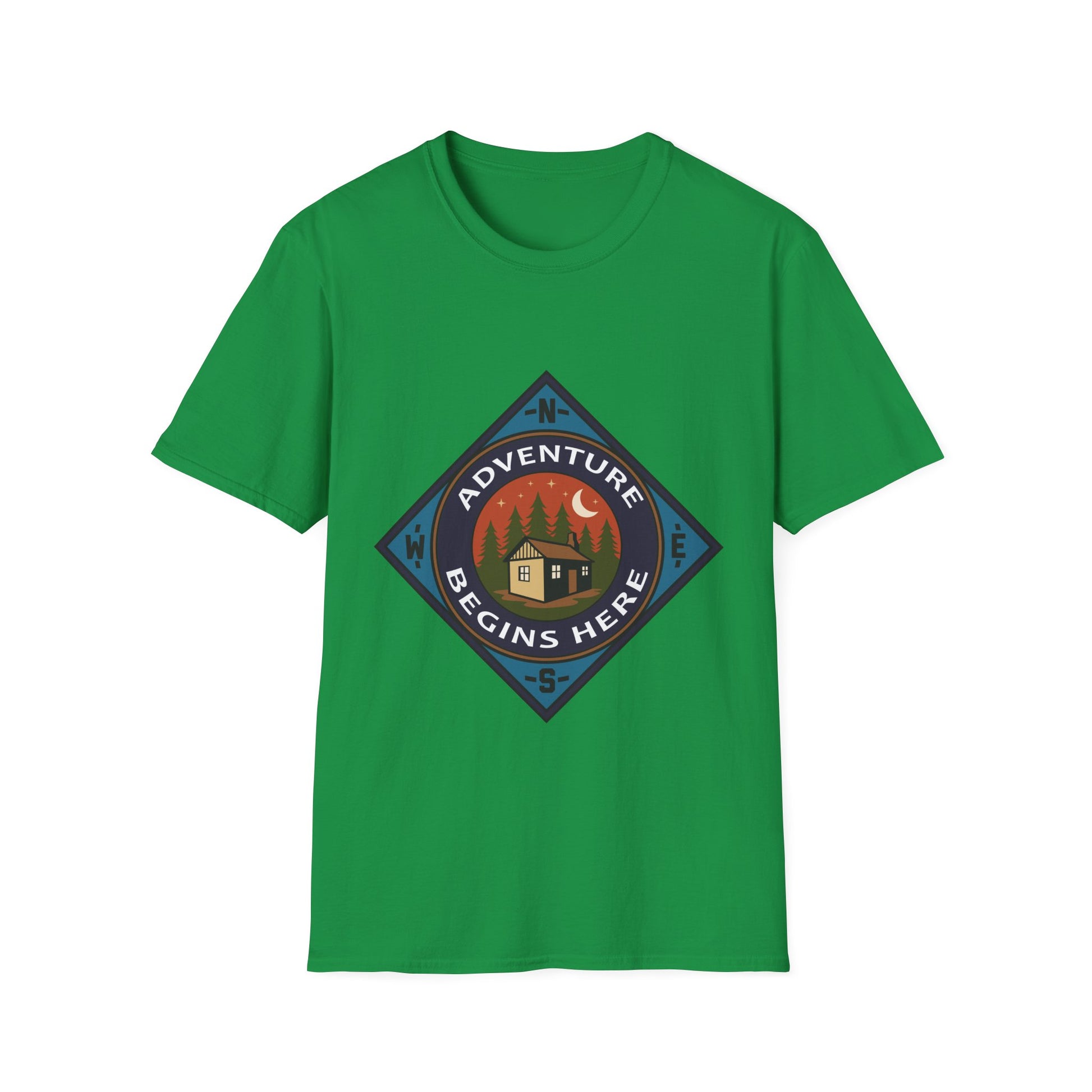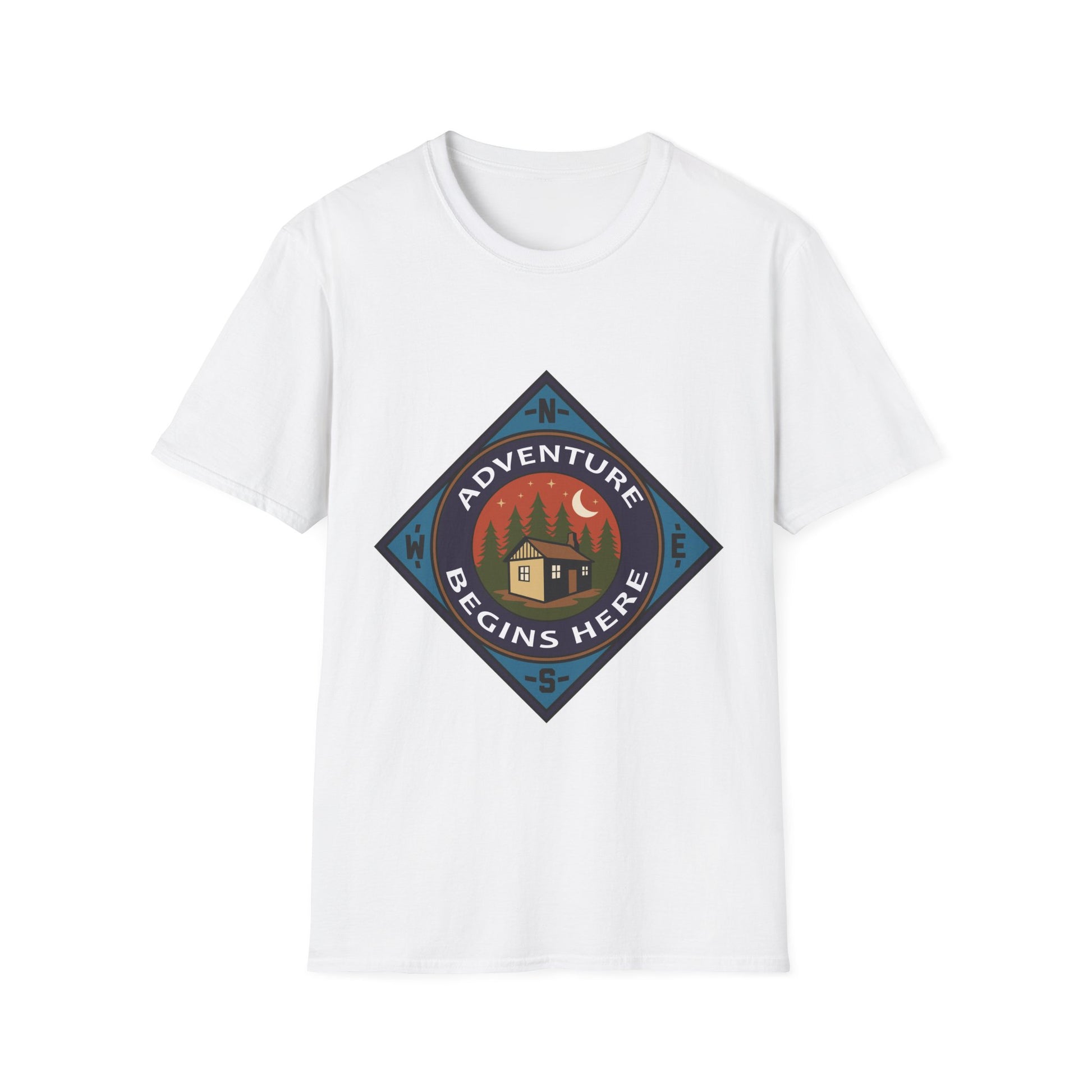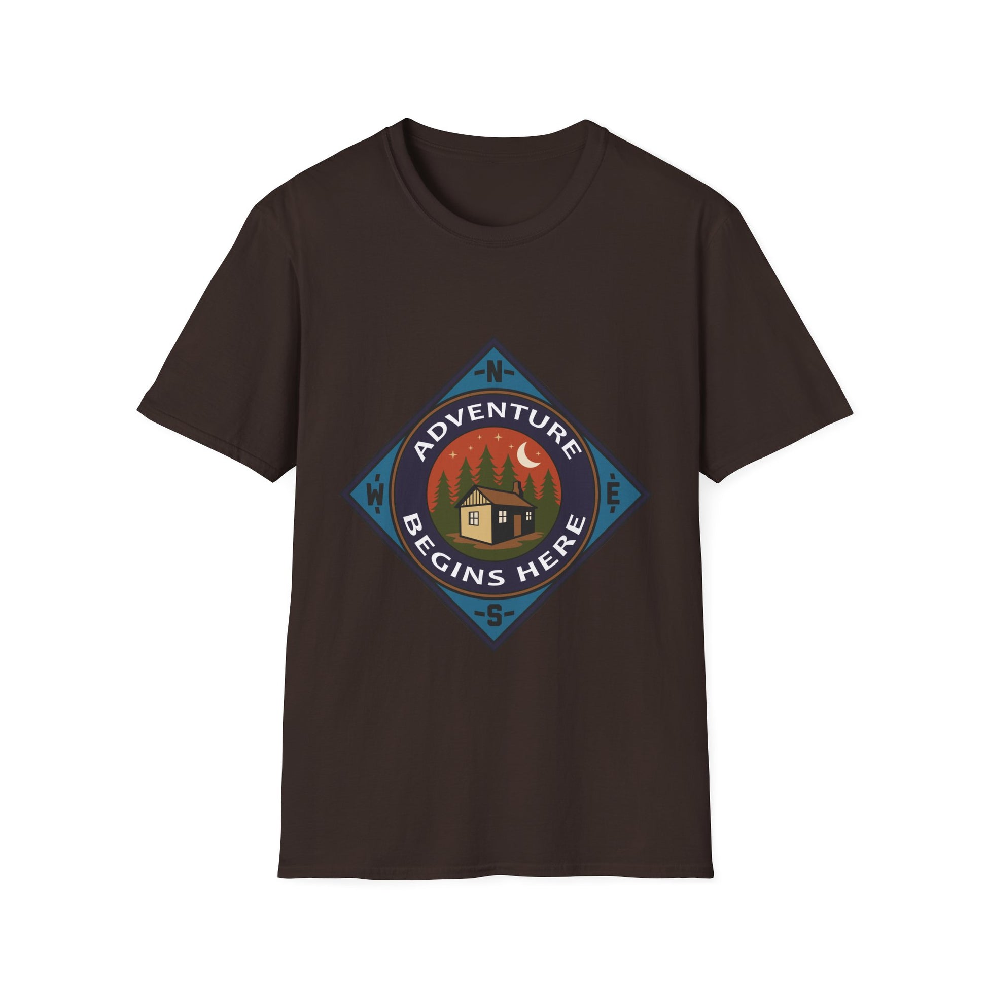 Bring a sense of adventure to your wardrobe with this unisex T-Shirt. The design 'Adventure Begins Here' sets the tone for exploration and new beginnings. Perfect for those who love the outdoors and seeking new experiences. Ideal for casual wear, travel, camping, and summer outings.