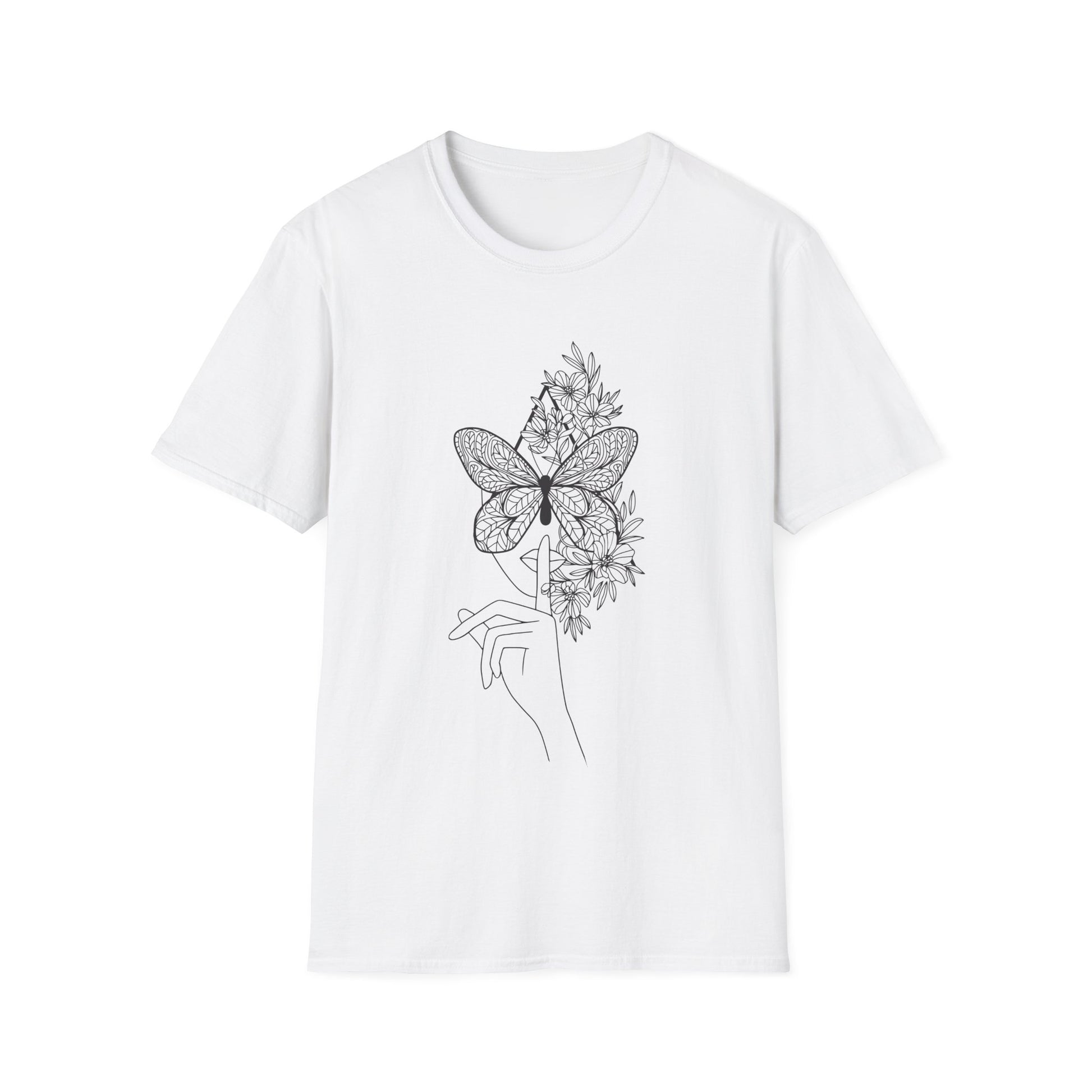 A softstyle T-Shirt featuring a line illustration of a butterfly, giving off a delicate and artistic vibe. Perfect for nature lovers and those who appreciate minimalist designs. Ideal for casual wear or as a statement piece for casual outings or nature-themed events.