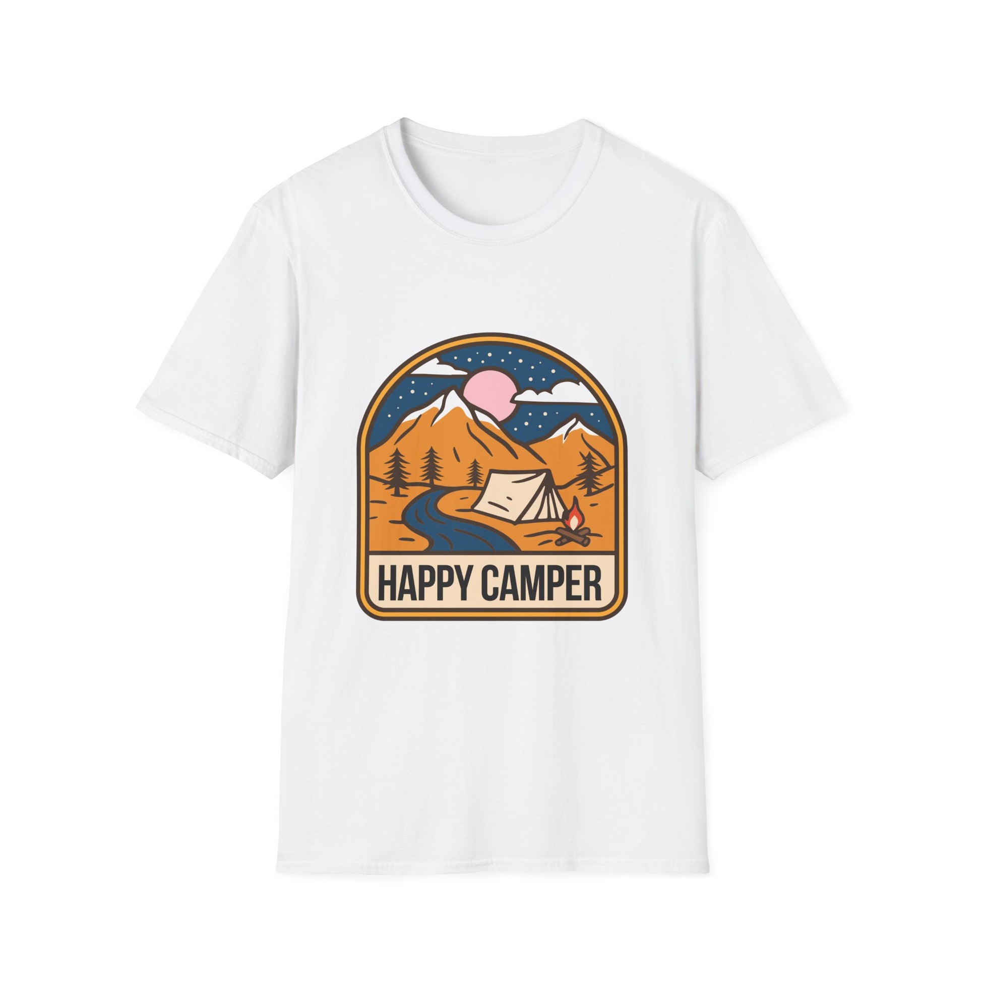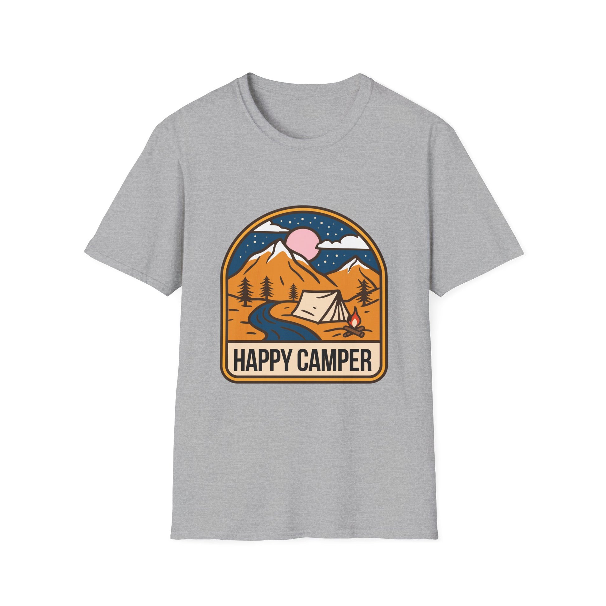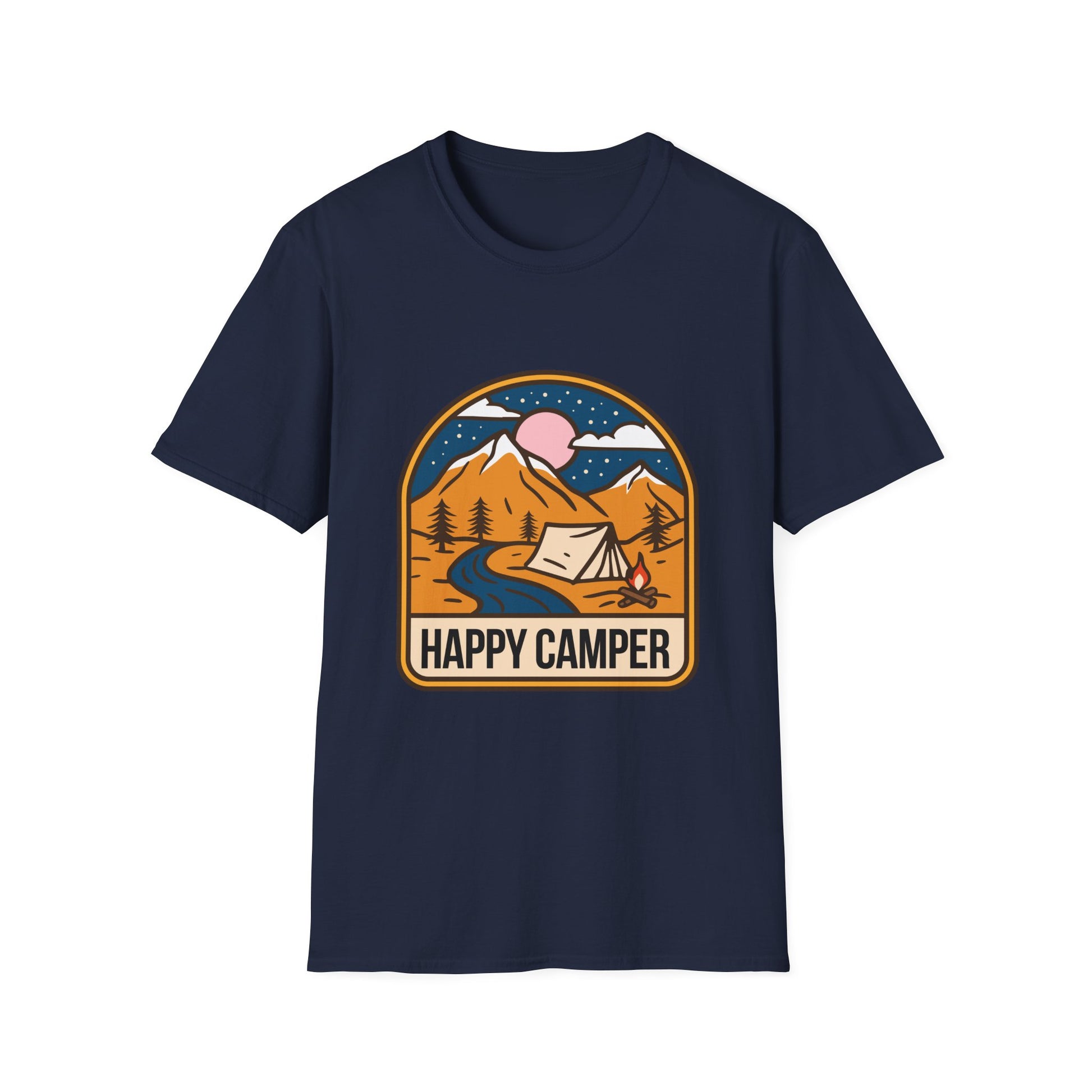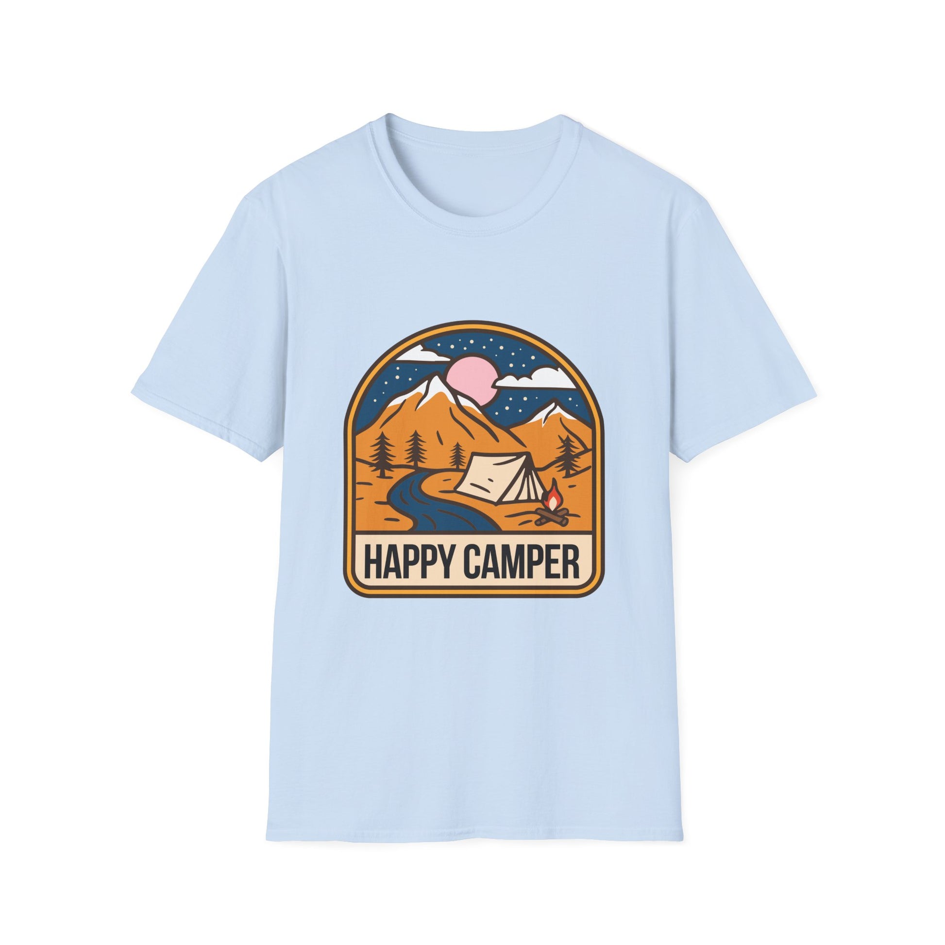 A 'Happy Camper' themed T-Shirt that exudes a cheerful and adventurous vibe, perfect for outdoor enthusiasts and nature lovers. It is ideal for casual wear or as a gift for camping enthusiasts, hikers, and nature lovers. This T-Shirt is relevant for holidays like National Camping Month.
