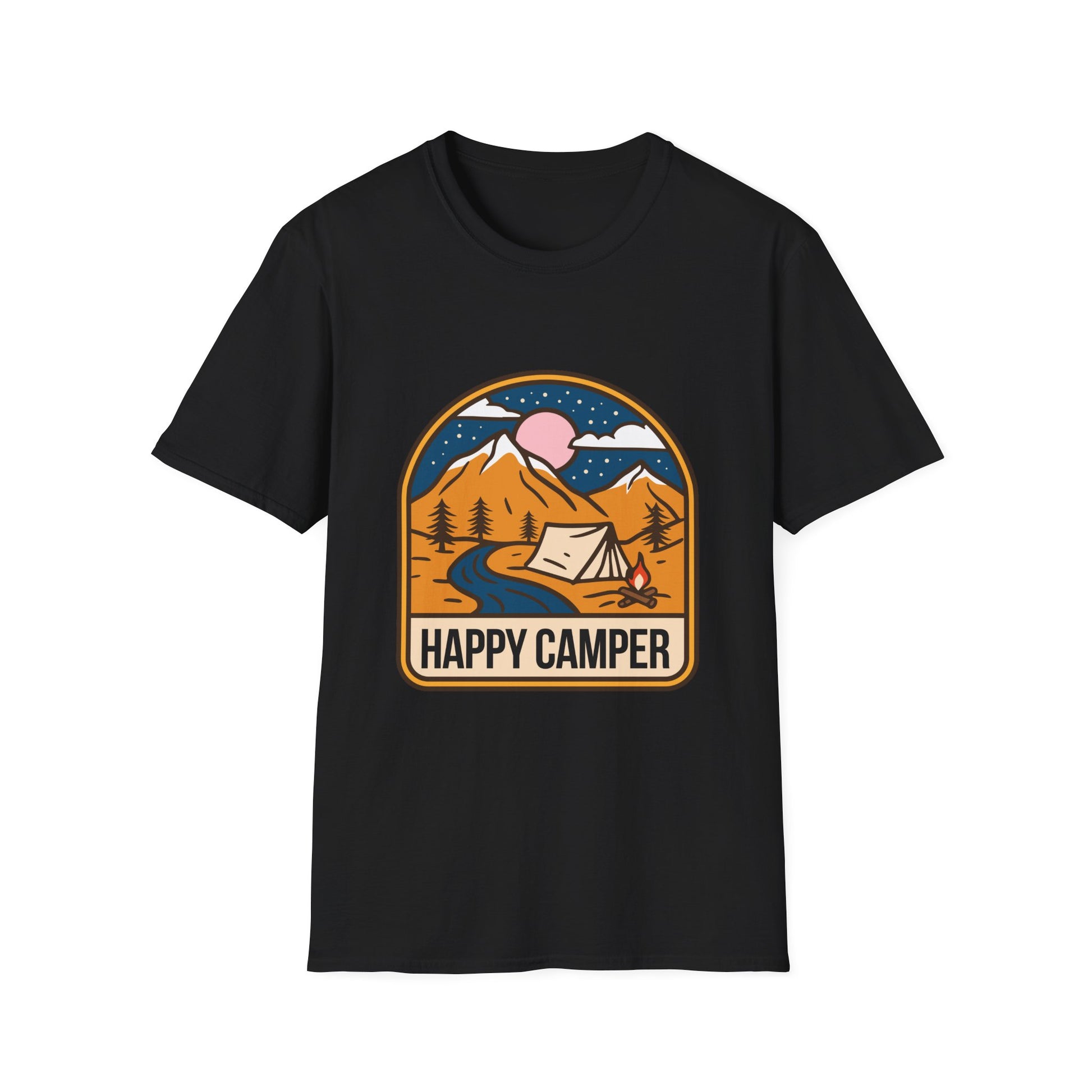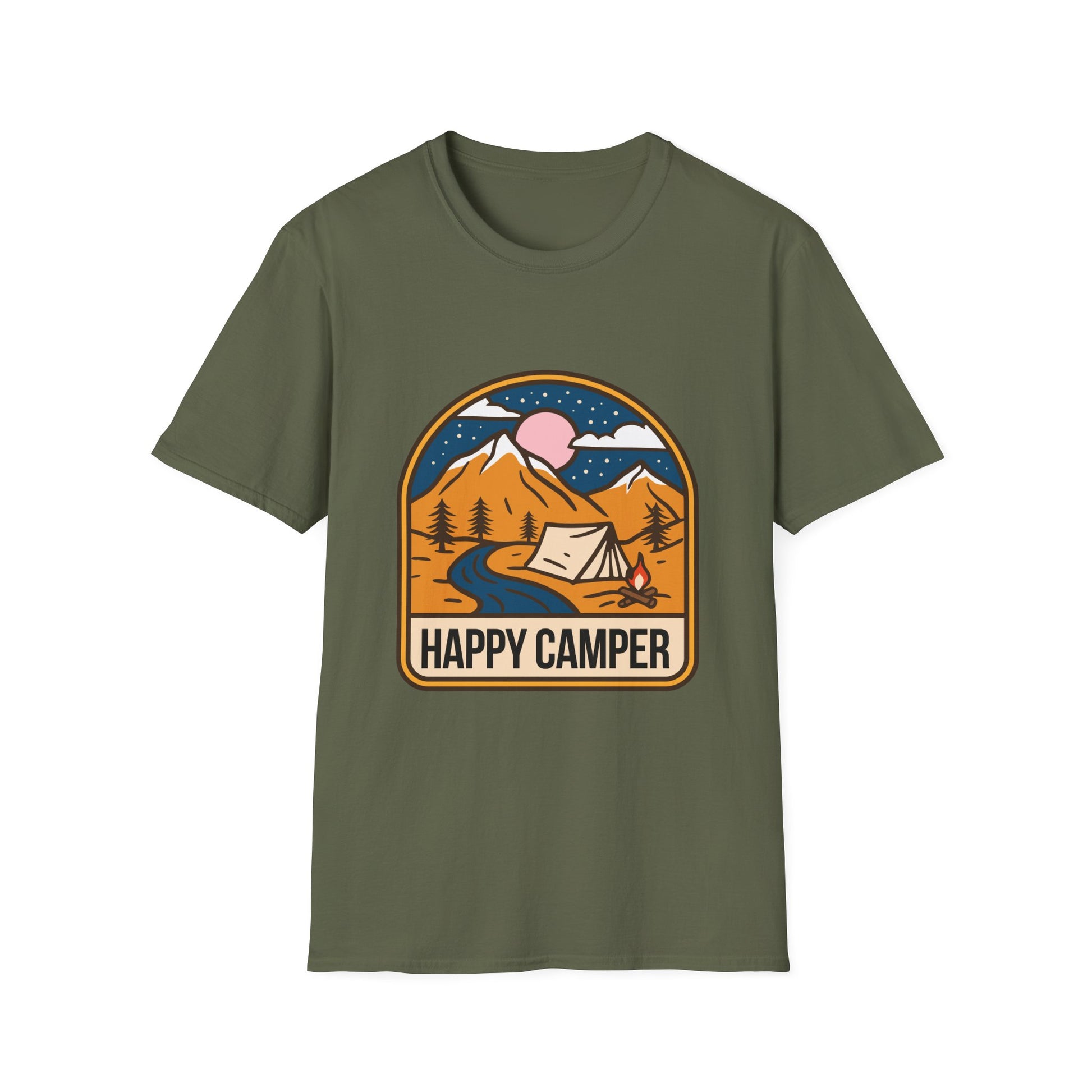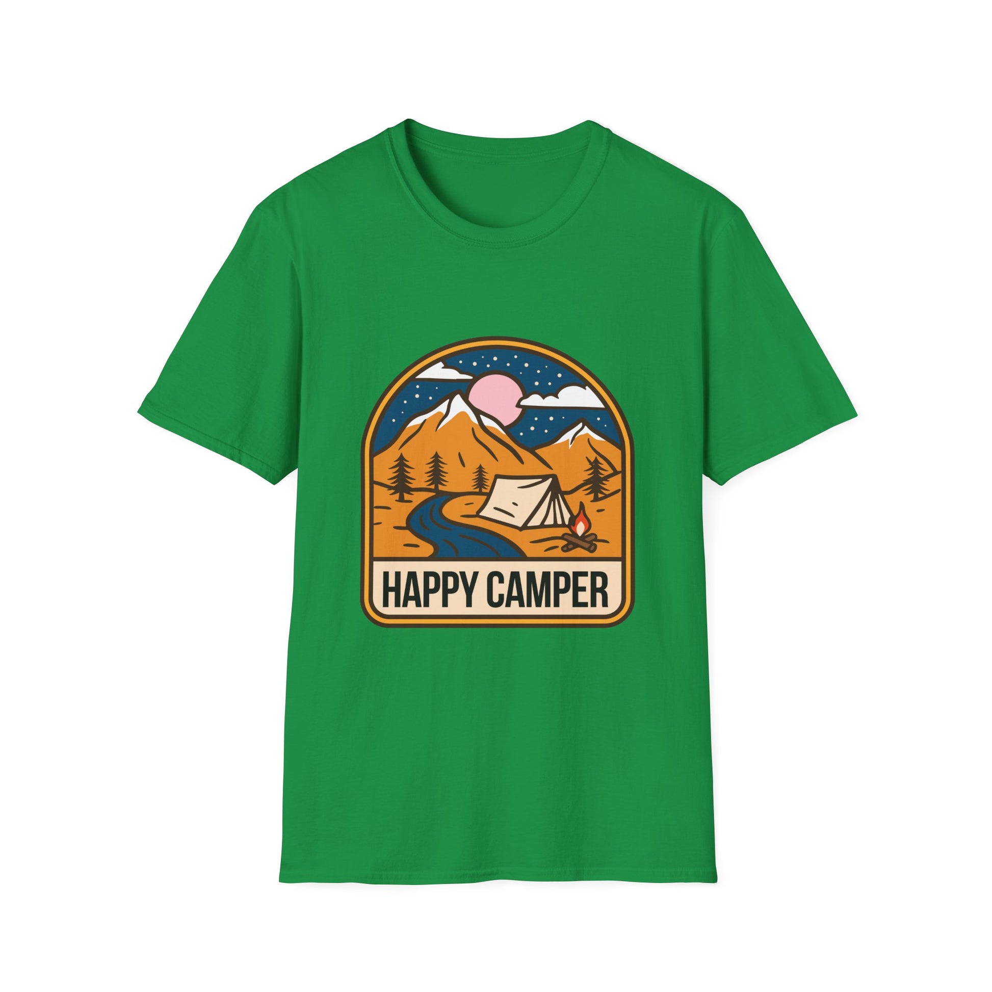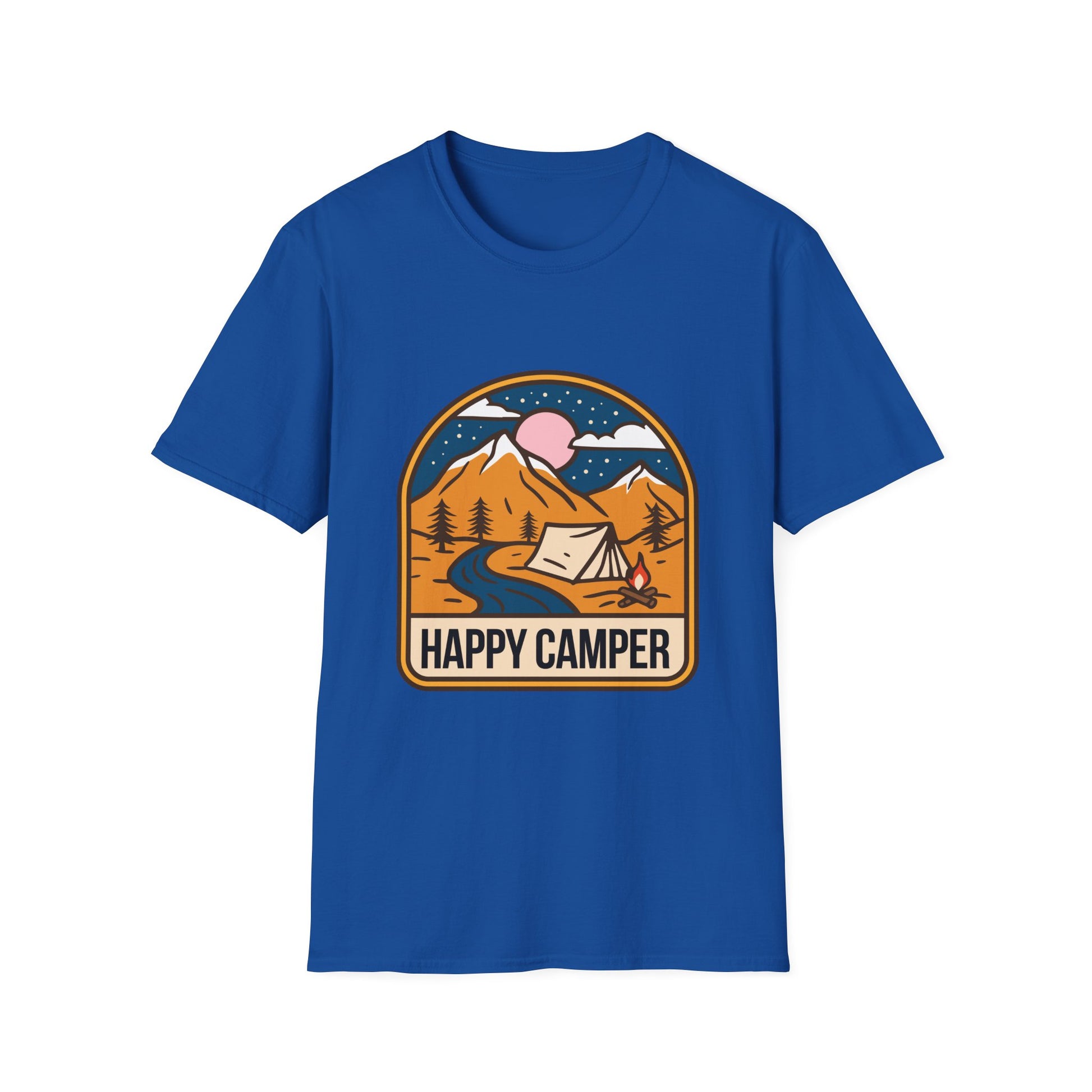 A 'Happy Camper' themed T-Shirt that exudes a cheerful and adventurous vibe, perfect for outdoor enthusiasts and nature lovers. It is ideal for casual wear or as a gift for camping enthusiasts, hikers, and nature lovers. This T-Shirt is relevant for holidays like National Camping Month.