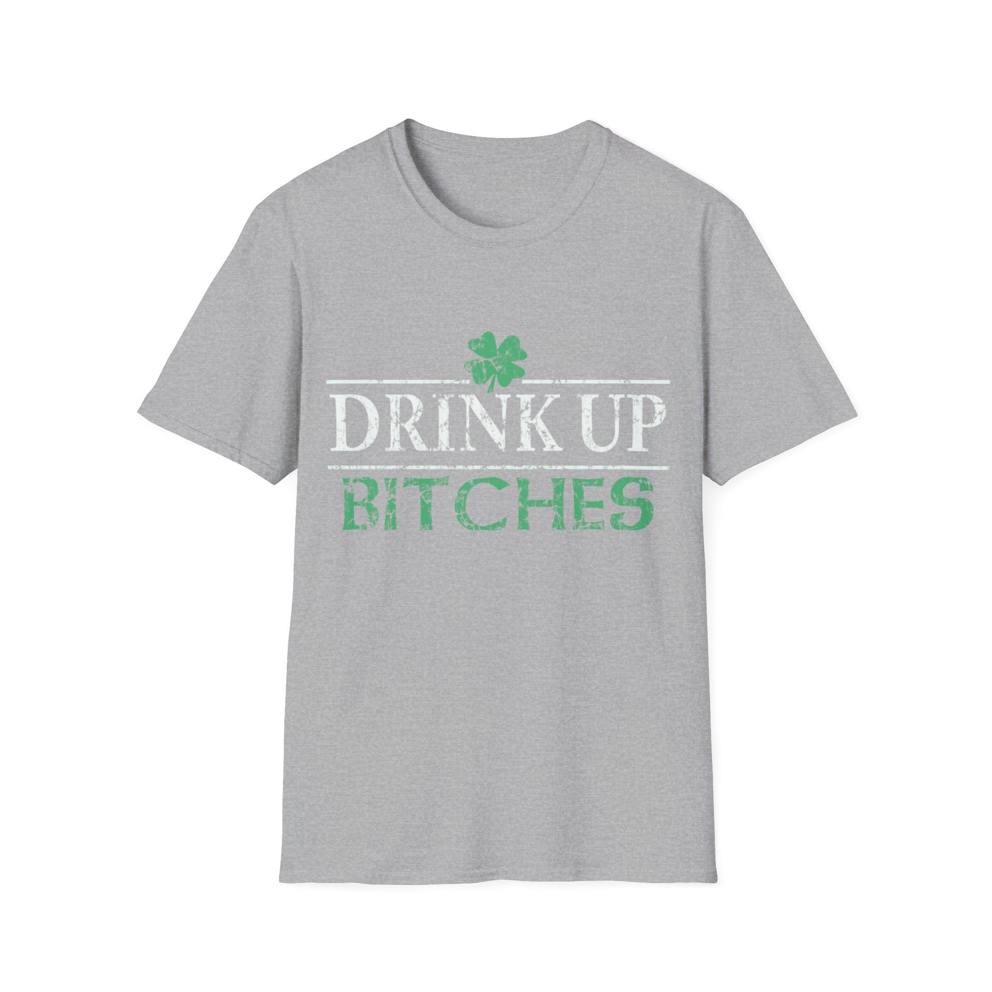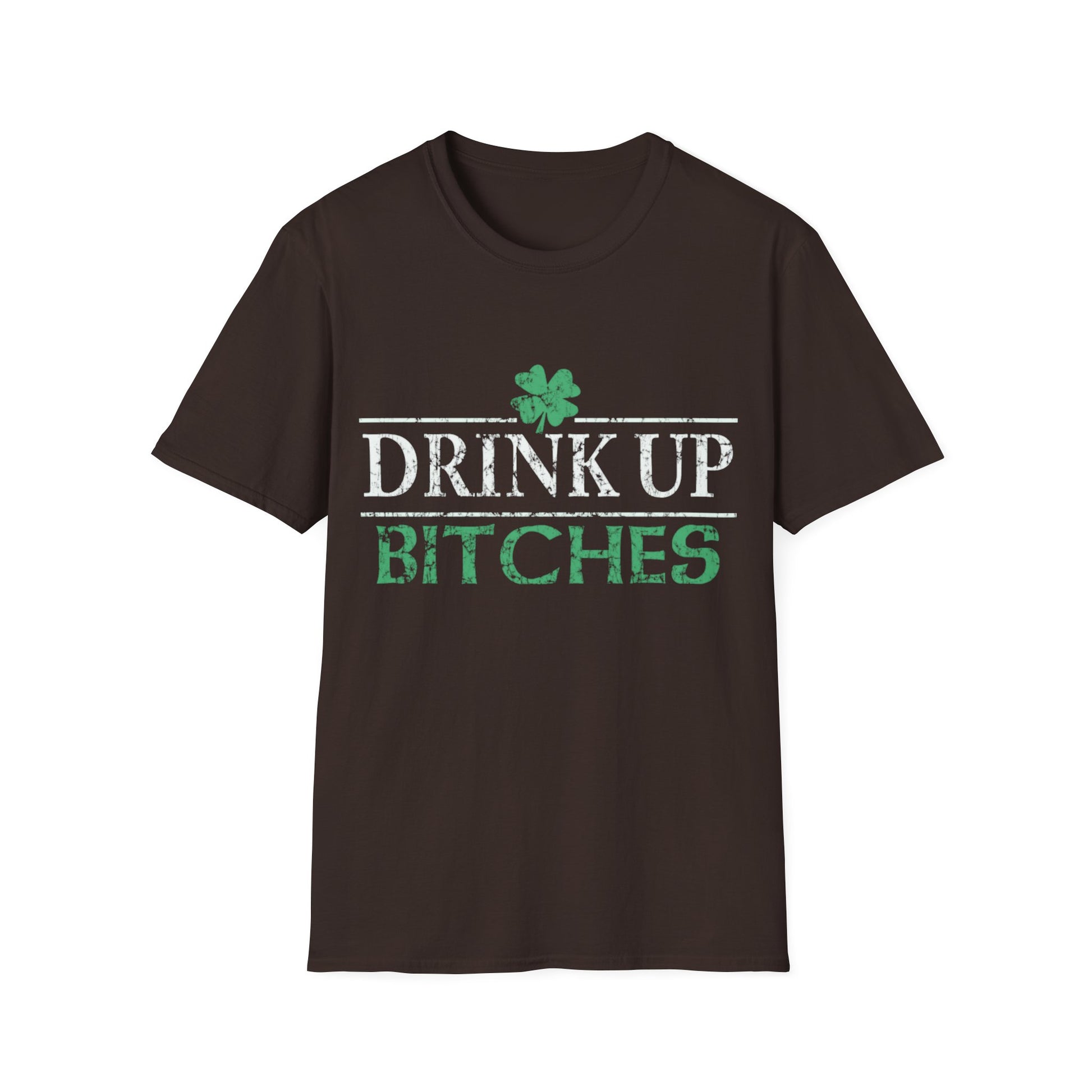 A fun and sassy T-Shirt featuring the bold text 'Drink Up Bitches'. Perfect for those who love quirky and humorous apparel. This casual tee can be worn for parties, girls' nights out, or casual events. Ideal for individuals with a playful sense of humor.