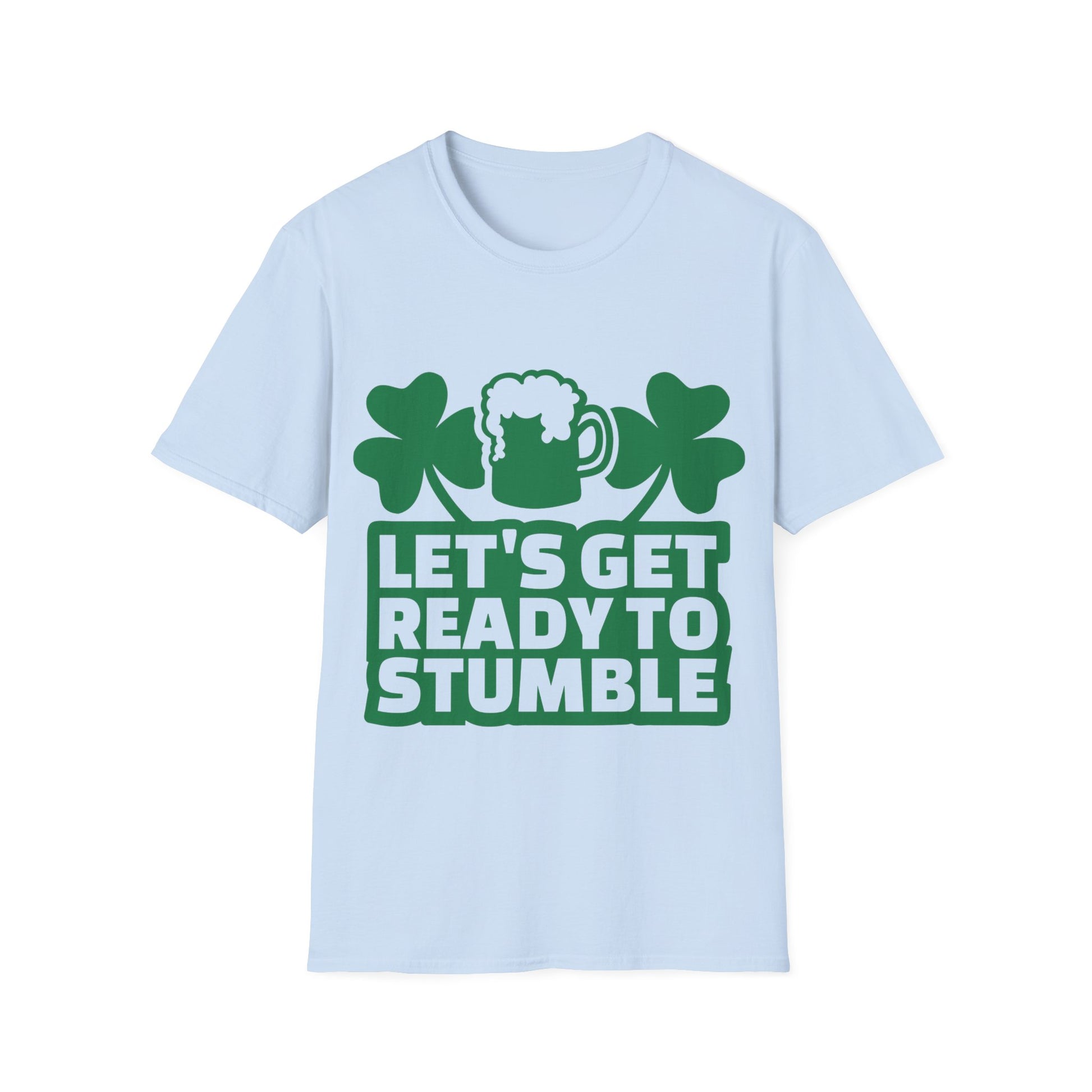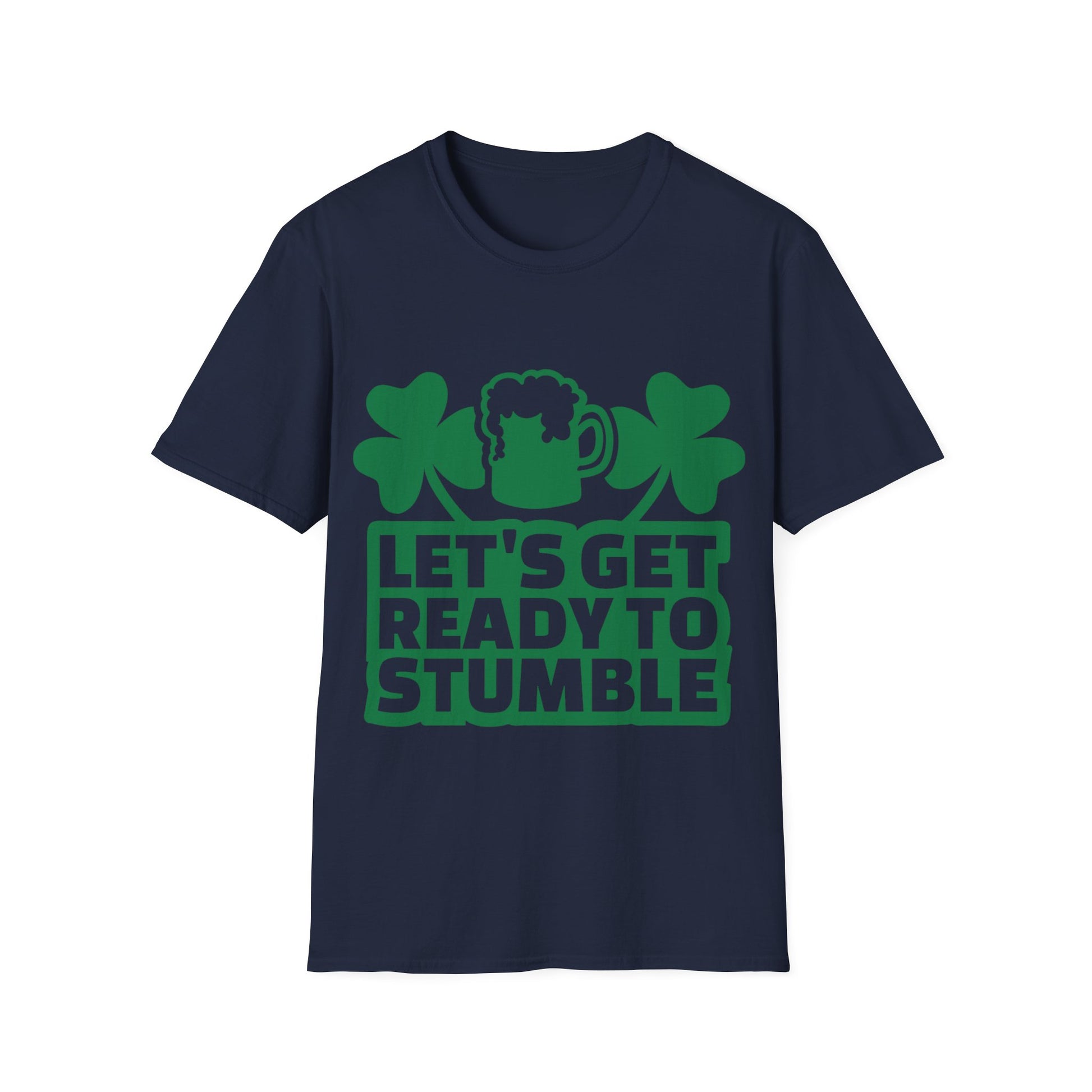 A fun and playful unisex T-Shirt with the phrase 'Lets Get Ready To Stumble' printed on the front. Perfect for those who enjoy a good time and want to add humor to their outfit. Great for casual outings, parties, and events. Ideal for adults looking for a comfortable and stylish tee to wear during celebrations and social gatherings.