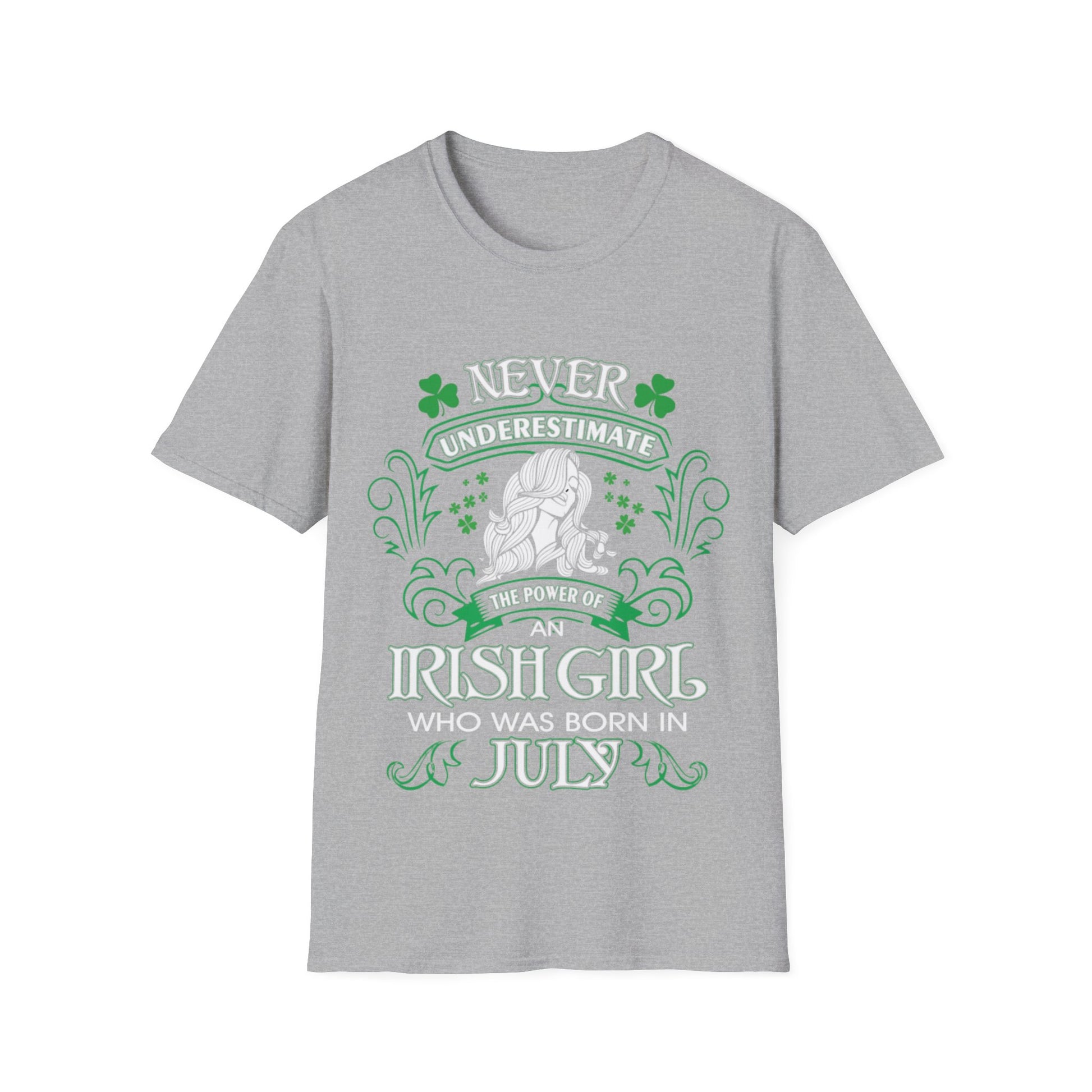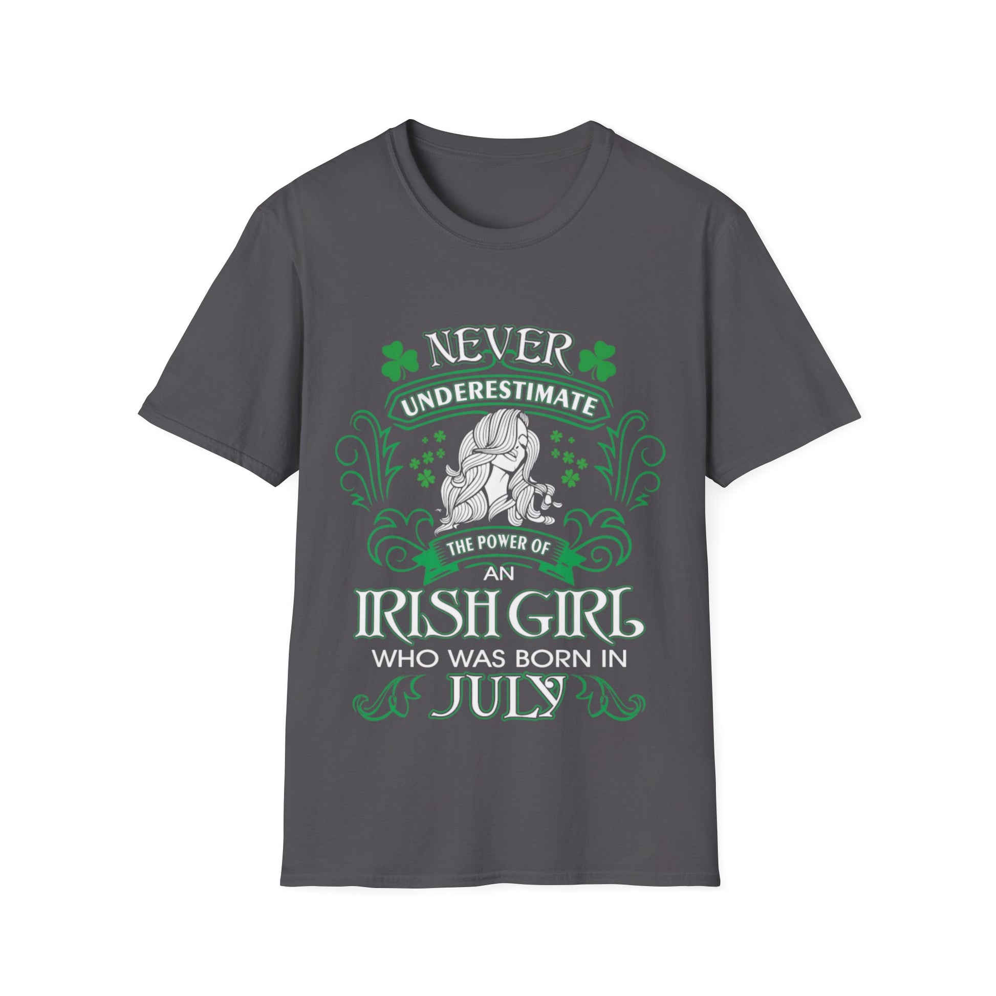 A unique and personalized T-Shirt design that celebrates the strength and pride of Irish girls born in July. This T-Shirt exudes a confident and spirited vibe, perfect for those looking to show off their Irish heritage or celebrate their birthday. Ideal for adults looking for a statement piece for casual wear or as a thoughtful gift for someone special. Relevant for St. Patrick's Day, birthdays, and any occasion where Irish heritage is celebrated.