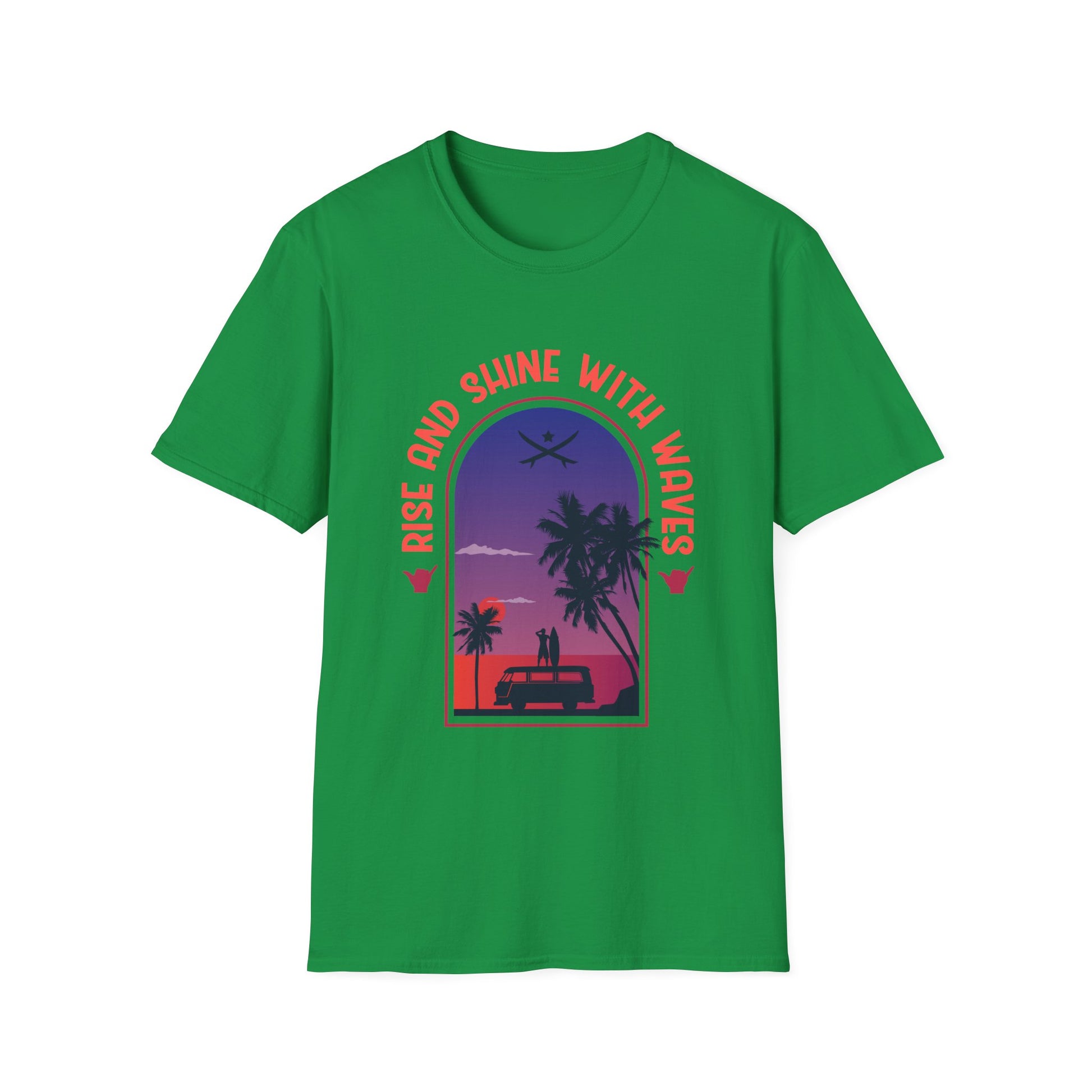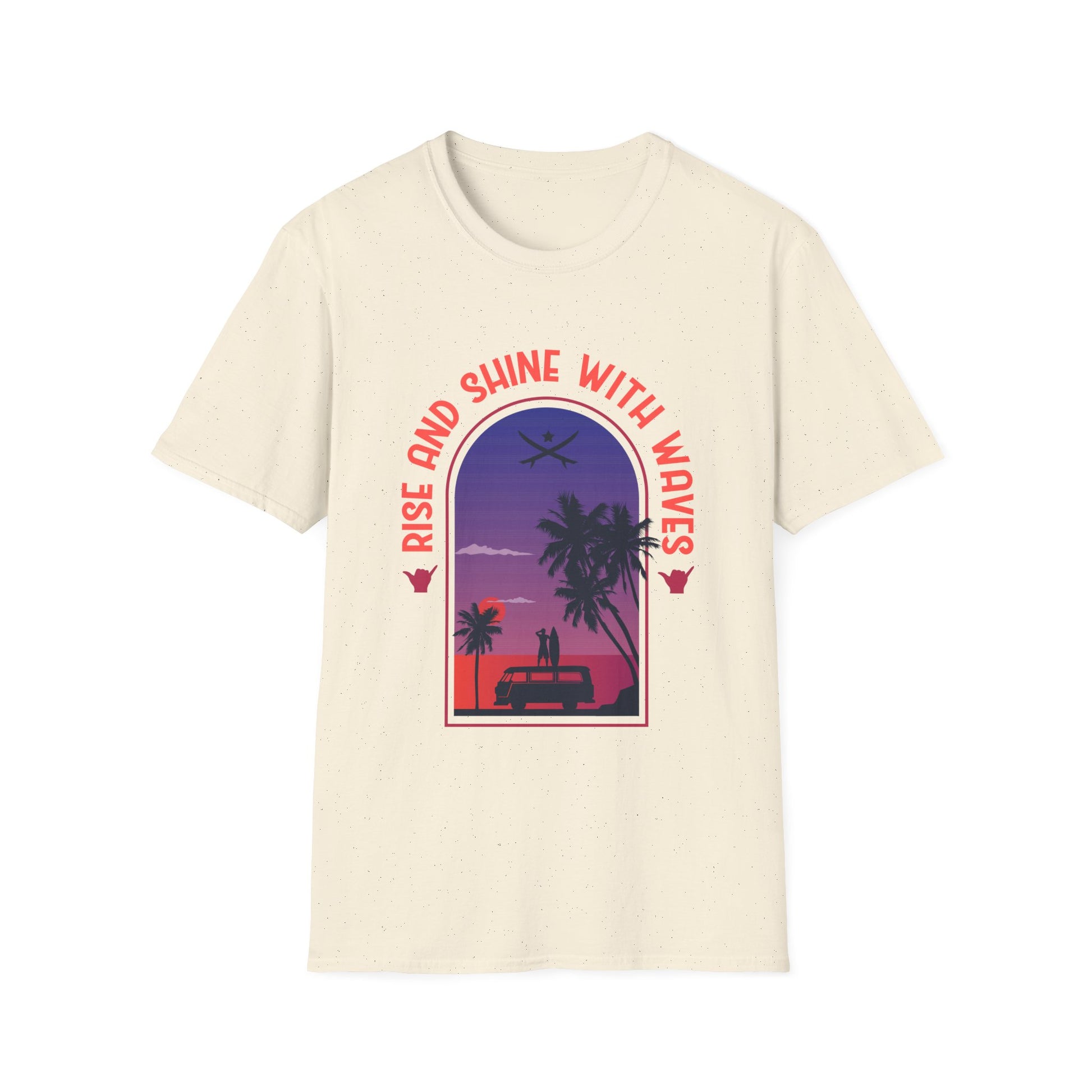 Rise and Shine with Waves. This T-Shirt exudes a relaxed and laid-back vibe, perfect for casual outings or lounging at home. It is ideal for those who enjoy a beachy, carefree style. Relevant for summer vacations, beach trips, and weekend getaways.