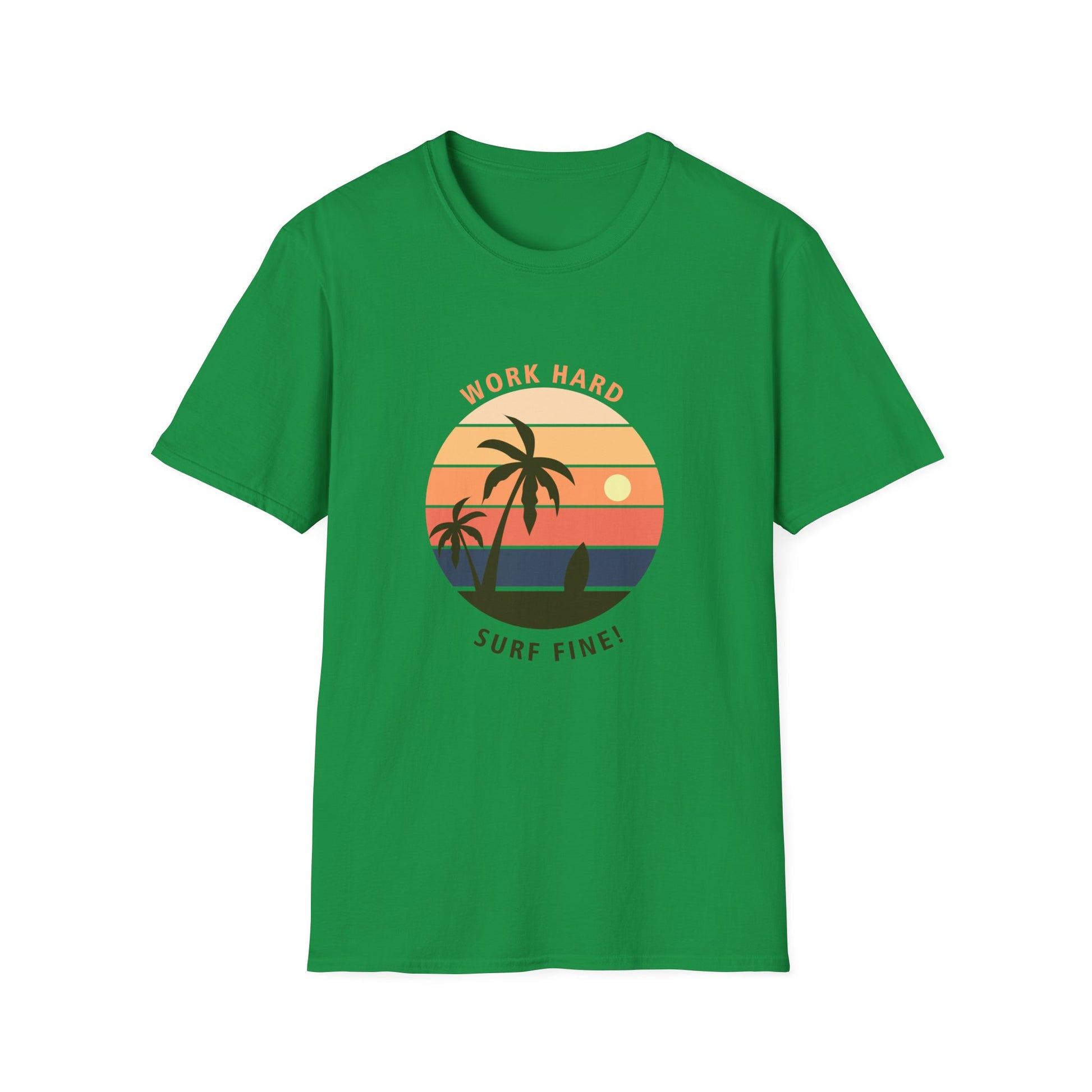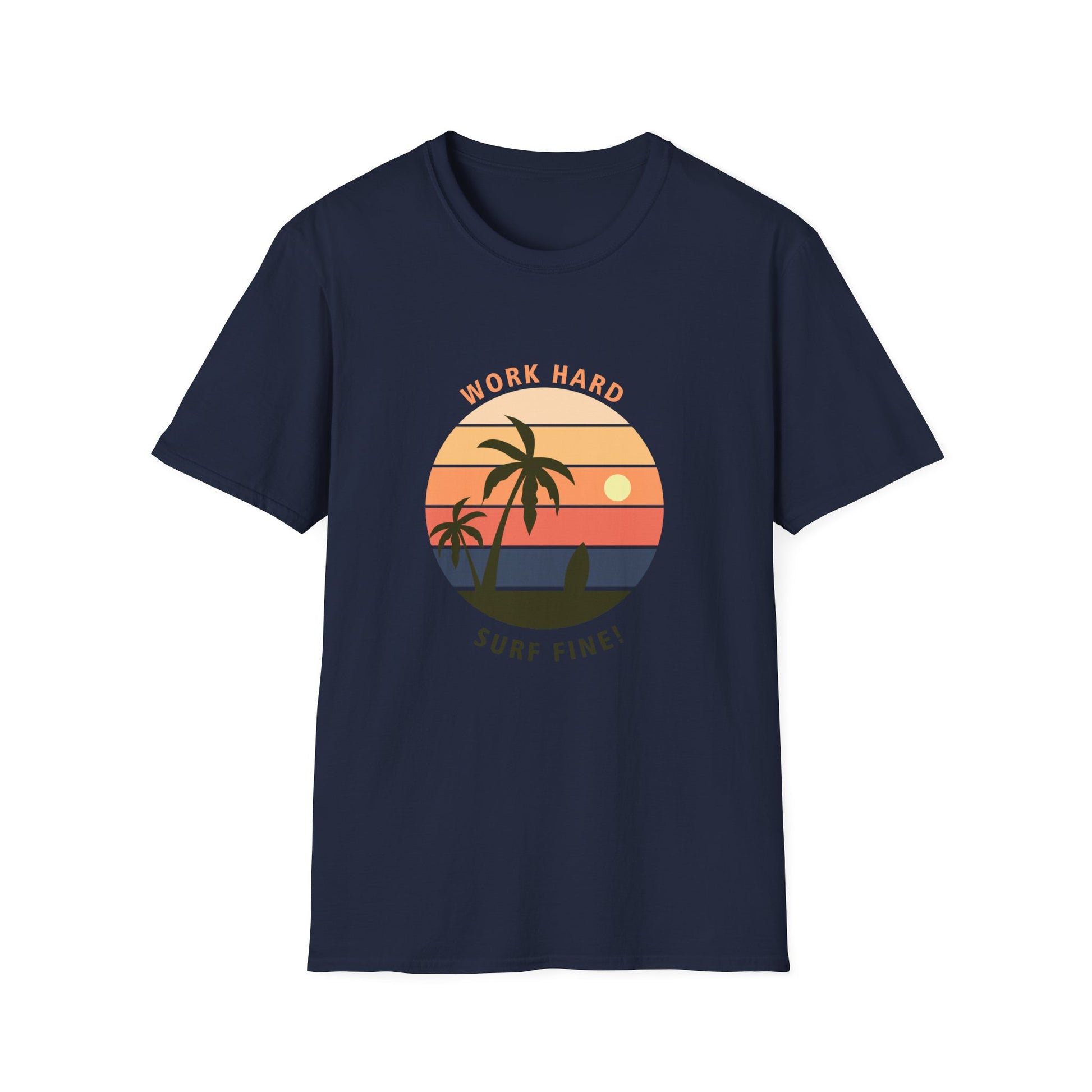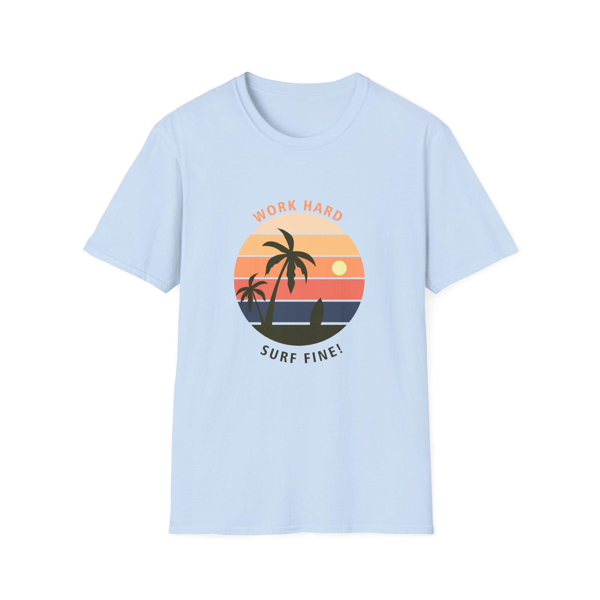 This T-Shirt with the design 'Work Hard Surf Fine' exudes a laid-back and adventurous vibe, perfect for anyone who loves surfing or beach activities. It's a versatile piece that can be worn casually or dressed up for a beach party or summer outing. Ideal for surfers, beach lovers, and outdoor enthusiasts. Perfect for summer holidays, beach vacations, and casual hangouts.